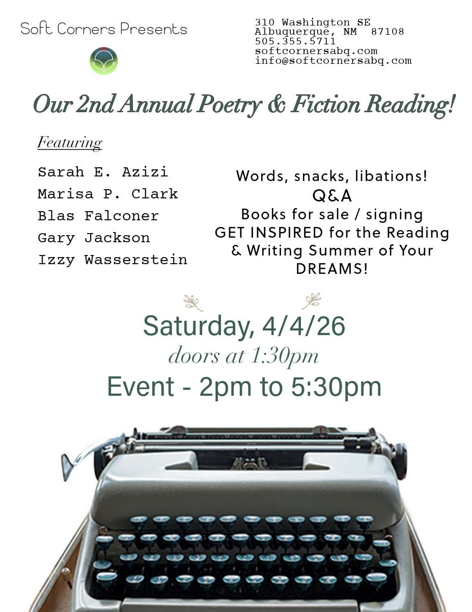 Rent Soft Corners for YOUR events, and come out for our art shows, poetry and prose readings, book launches, soirees, and more ...!
